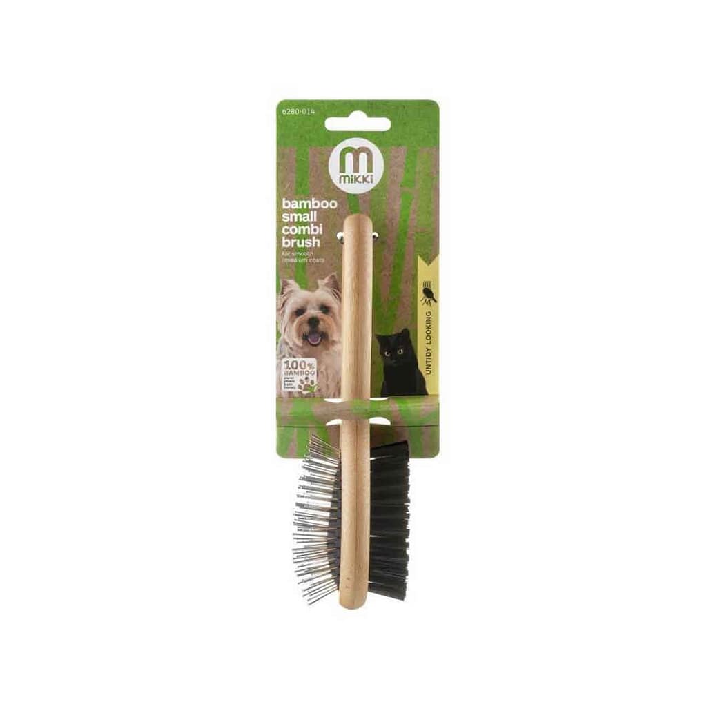 Nylabone Bamboo Çift Taraflı Küçük Fırça, küçük ırk köpekler ve kediler için özel olarak tasarlanmış ergonomik ve çevre dostu bir tüy bakım ürünüdür. Bir yüzü yumuşak kıllarla nazik temizlik sunarken, diğer yüzü top uçlu tarak başlığı ile düğüm açma ve masaj etkisi sağlar. Bambu sapı ile hem doğaya saygılı hem de şık bir tasarım sunar.