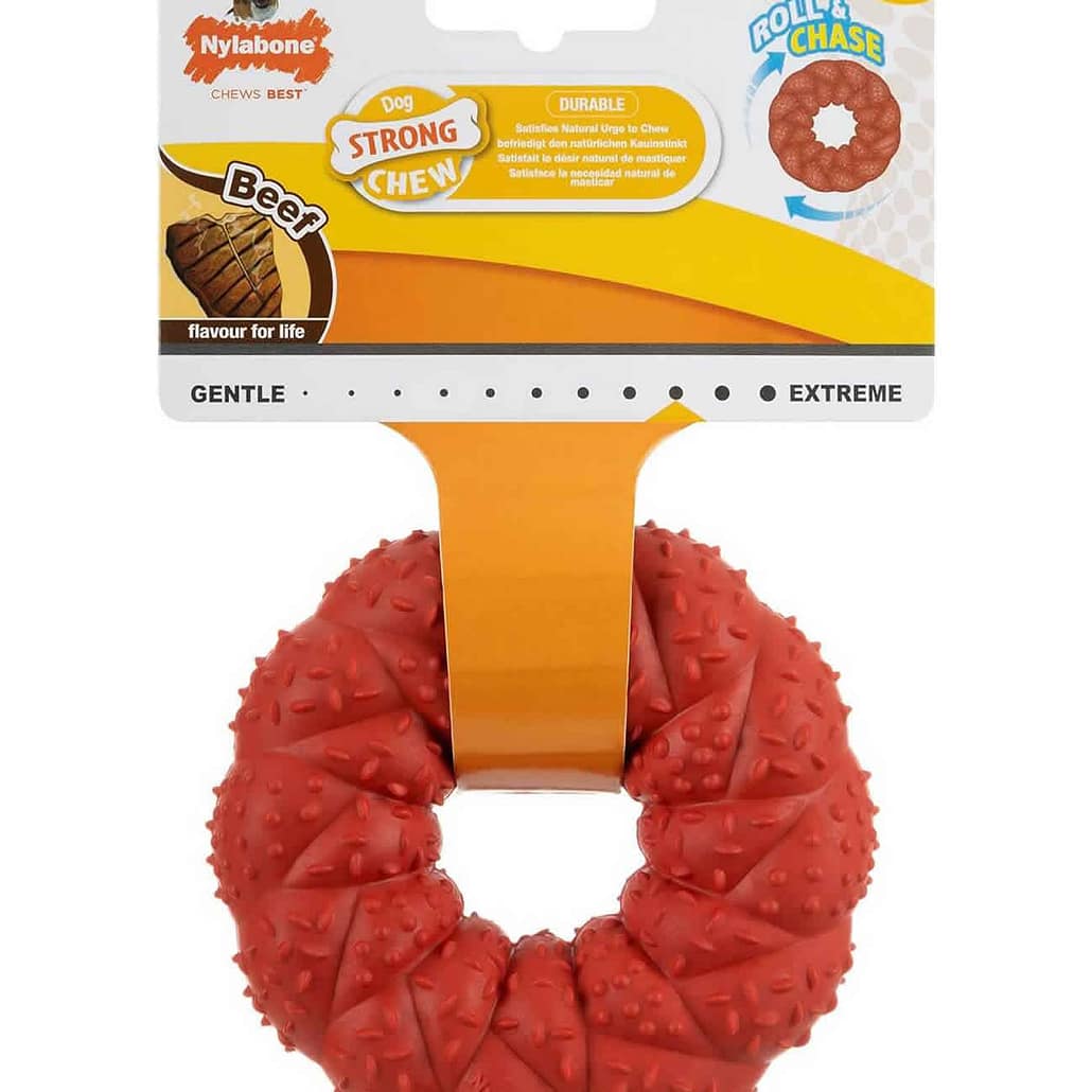 Nylabone Biftek Aromalı Doğal Güçlü Kemirme Halkası, doğal içeriklerle üretilmiş, biftek aromasıyla cezbedici ve orta boy köpekler için özel olarak tasarlanmış bir çiğneme oyuncağıdır.